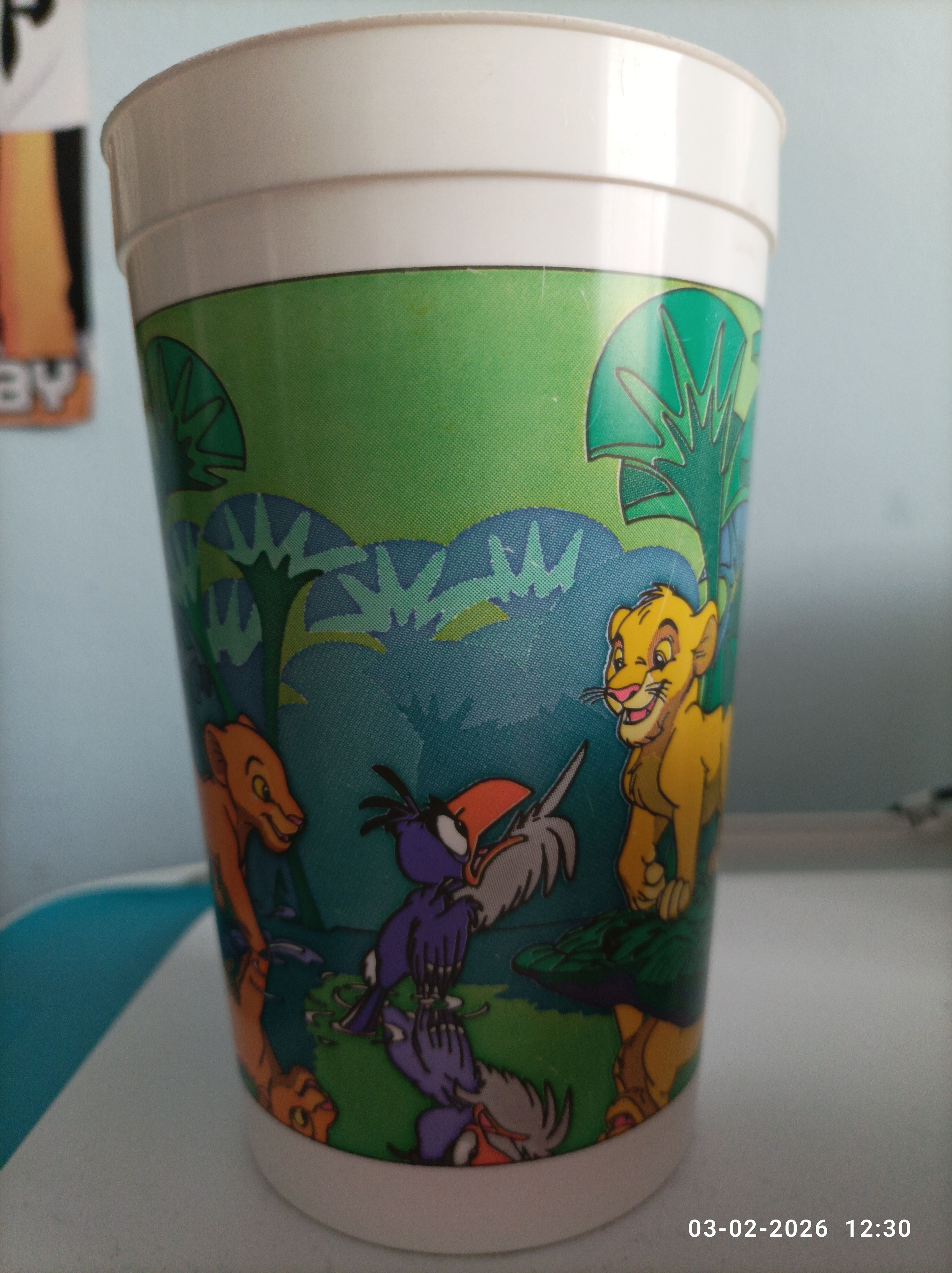 Teljesen véletlen találtam rá Vaterán erre az Burger King - Coca-Cola Oroszlánkirályos pohárra. Nem is haboztam rá licitálni, ma megérkezett. Örülök neki, mert ez 1995-ből származik, és főleg a '90-es évekből gyűjtök Disney-s cuccokat. Ez a pohár nekem főleg azért különleges, mert a Burger King elég későn, csak 2016-ban jutott el Békéscsabára. Pesten voltam már korábban is, de gyerekkoromban egyáltalán nem, így ez nekem kuriózum. A kép is nagyon menő, konkrétan A trón úgy csábít dalának "De nem vagy se nagy, se király, míg hajad nem sörény" sorát vizualizálja. Nagyon jó állapotú, teljesen rendben van, egyedül az alját kell megtisztítani, és akkor inni is lehet belőle. Mosogatószerrel nem sikerült, valószínűleg hipó kell hozzá. Örülök neki, ilyeneket is szívesen gyűjtök. Állítólag sorozat van ezekből a poharakból, ha találok meg, megveszem.